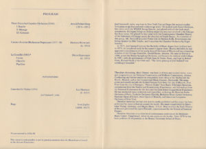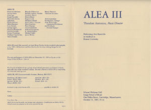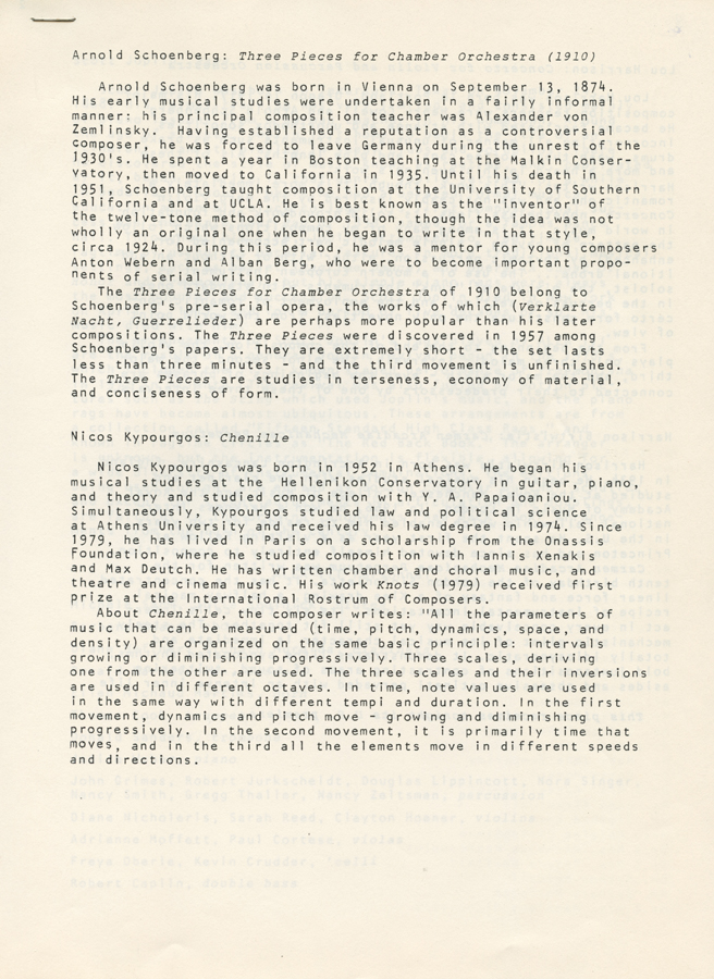 Chenille (Κάμπια), για φλάουτο, κλαρινέτο, κλαρινέτο μπάσο, βιολί, βιόλα, βιολοντσέλο και κρουστά. 1983 Παραγγελία ALEA III Α’ εκτέλεση: Ορχήστρα ALEA III, Βοστώνη, 21 Οκτωβρίου 1983, διευθ. Θόδωρος Αντωνίου View Fullscreen