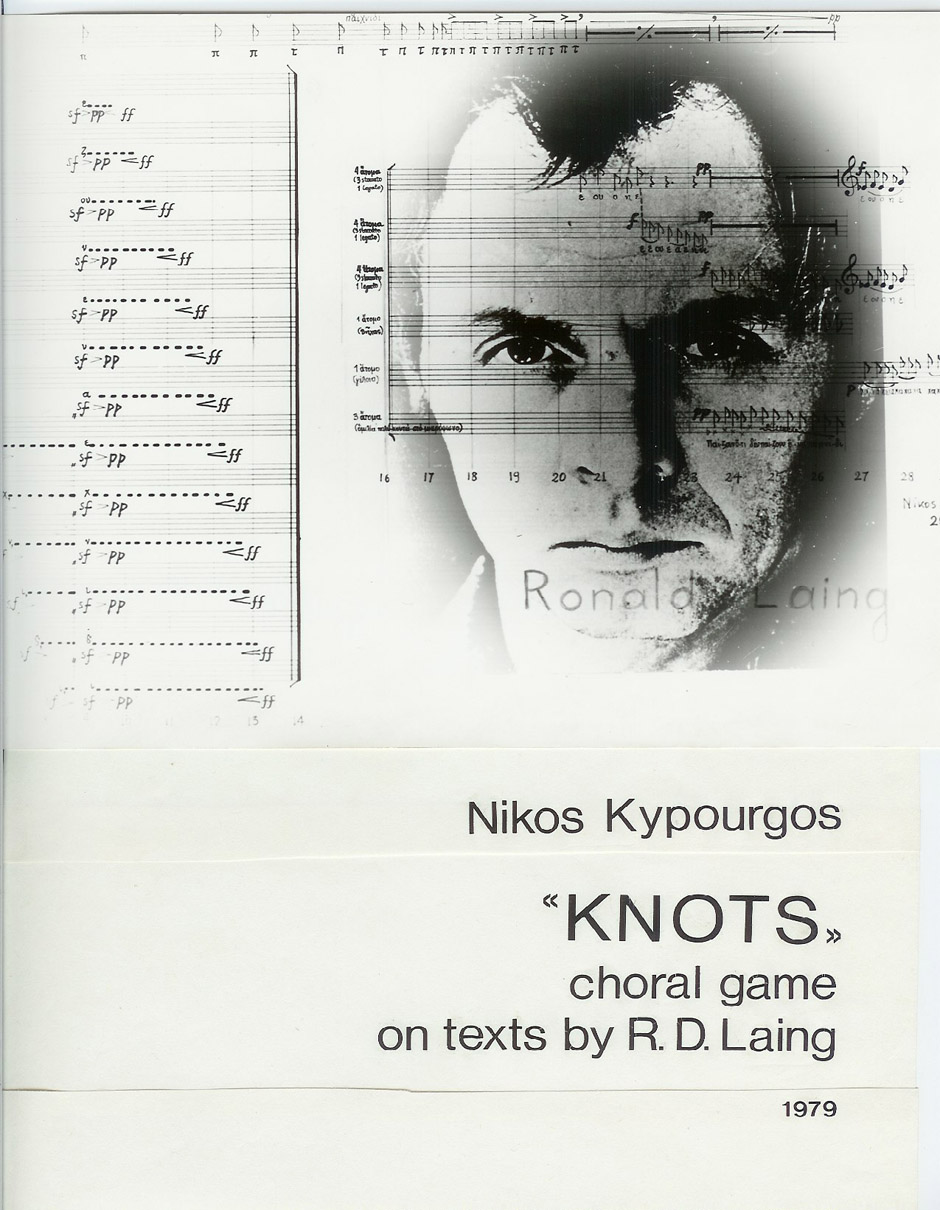 Knots (Κόμποι) σε κείμενα R.D.Laing, χορωδιακό παιχνίδι γιά δεκαέξι φωνές. 1979 Α’ βραβείο στο Διεθνές Βήμα Συνθετών της UNESCO, Παρίσι 1979 Α’ εκτέλεση-ηχογράφηση: Χορωδία Γ’ Προγράμματος ΕΡΤ, διευθ. Α.Κοντογεωργίου, ΕΡΤ, 1979 View Fullscreen https://nikoskypourgos.com/wp-content/uploads/2020/03/1979-Knots-B-short-157.mp3