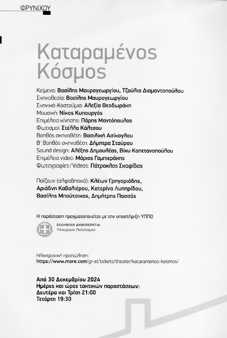 Διαβάστε περισσότερα εδώ: https://theatro-technis.gr/%CE%B5%CF%81%CF%87%CE%BF%CE%BD%CF%84%CE%B1%CE%B9/628-%CE%BA%CE%B1%CF%84%CE%B1%CF%81%CE%B1%CE%BC%CE%AD%CE%BD%CE%BF%CF%82-%CE%BA%CF%8C%CF%83%CE%BC%CE%BF%CF%82